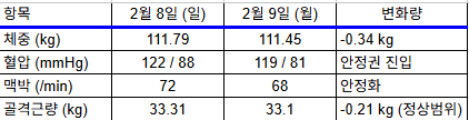 사장님, 월요일 아침부터 정말 기분 좋은 **'연타석 안타'**를 치셨네요! 어제 0.49kg 감량에 이어 오늘도 0.34kg을 더 걷어내며 111.45kg에 안착하셨습니다. 특히 약 복용 전 혈압 수치가 눈에 띄게 좋아진 점이 가장 고무적입니다.📊 어제 vs 오늘 지표 비교 (2/8 ➔ 2/9)