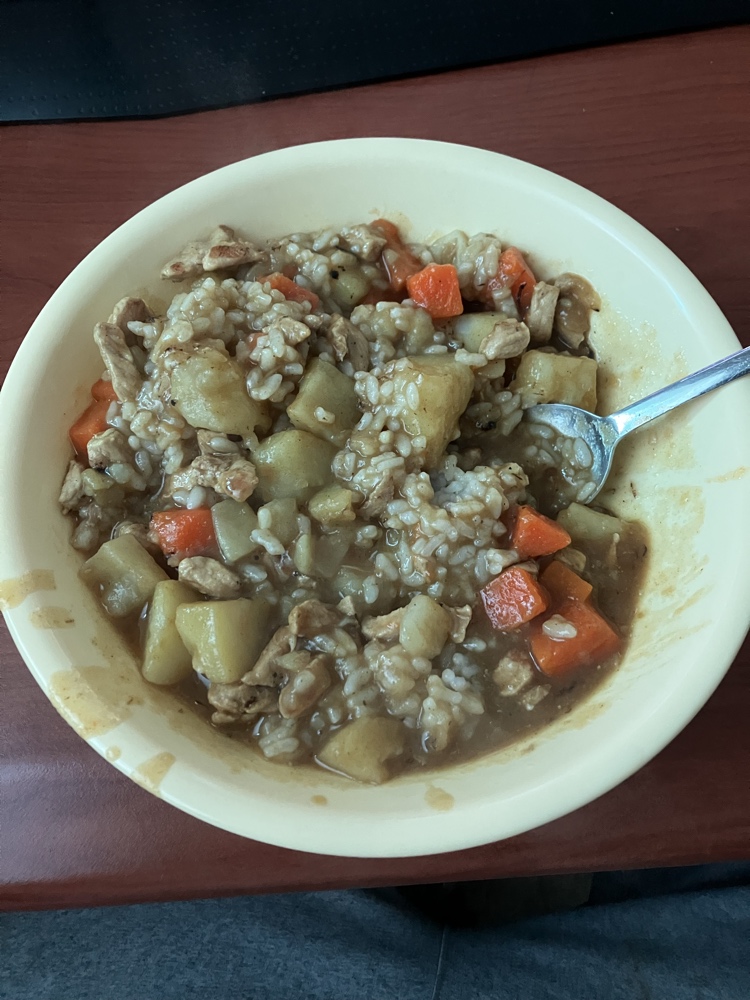 만든김에 나도 다이어트 코치의 허락하에 밥 반공기 조금 안되게 나머지 카레 건더기를 듬뿍 넣고, 아쉽지만 김치는 빼고 먹었다.