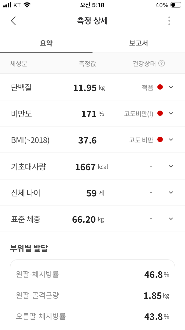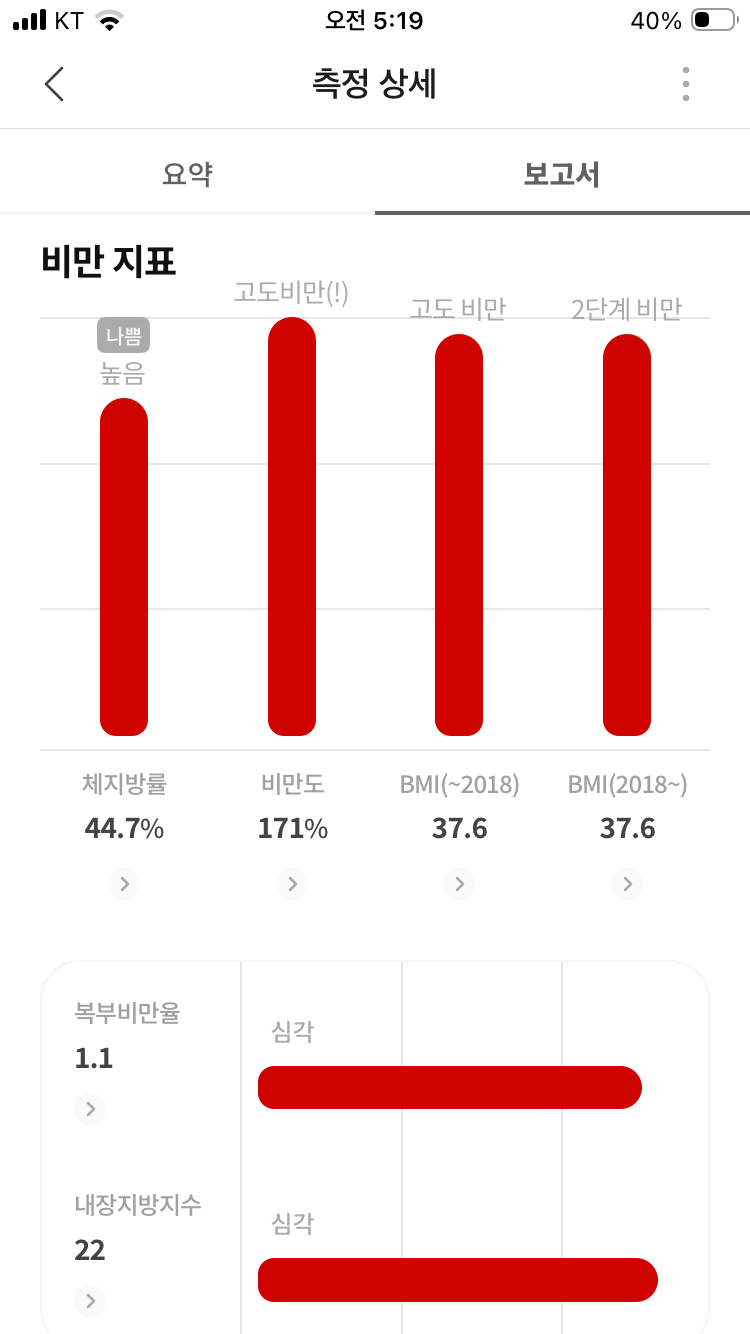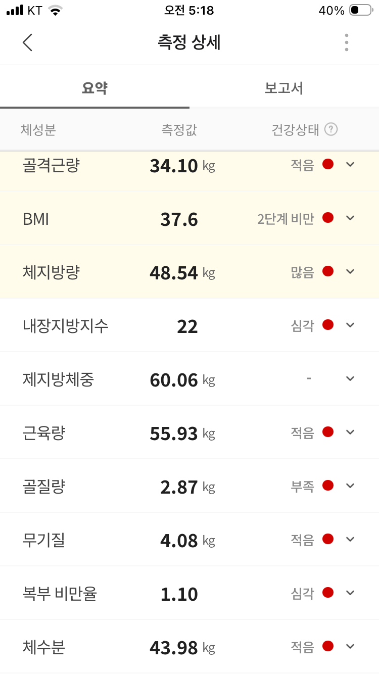 내장지방 지수가 다시 한자리 내려갔다. 23에서 꽤 오랫동안 버텼었는데 22다.
