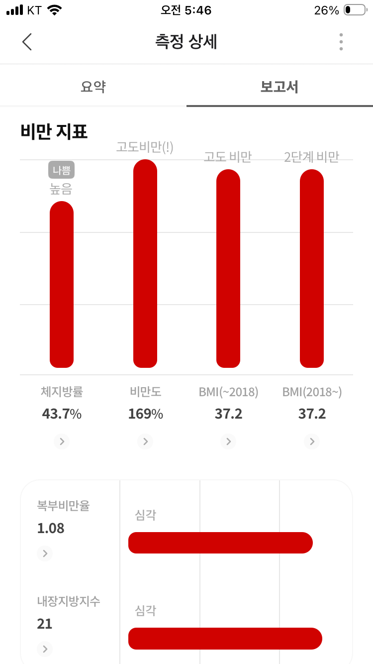 내장지방 지수가 21로 떨어진점이 맘에 든다. 108킬로대에 진입하면서 22로 떨어지더니, 107킬로대에 진입하면서 다시 21로 떨어졌다. 제대로 다이어트가 이루어지고 있다.