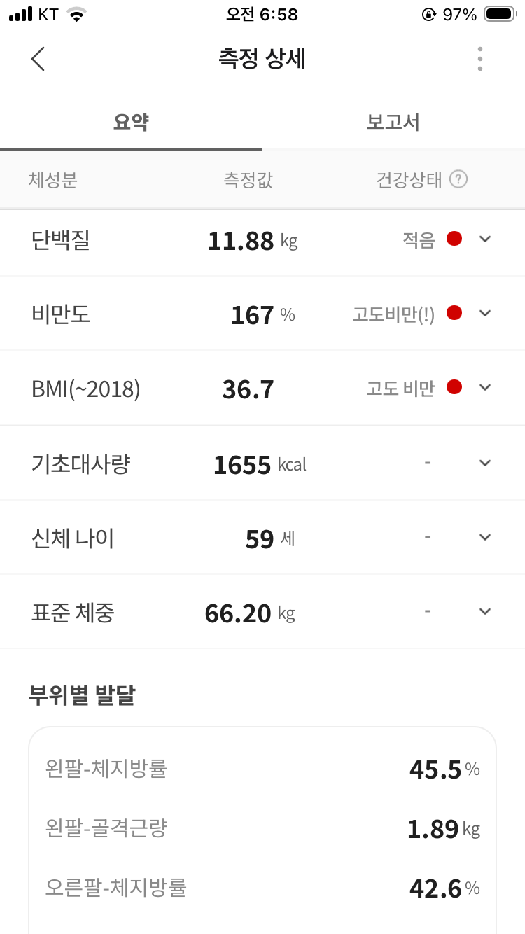 아쉽게도 체중이 106kg 댈 올랐다. 하지만 인바디 결과 자체는 어제보다 좋다.